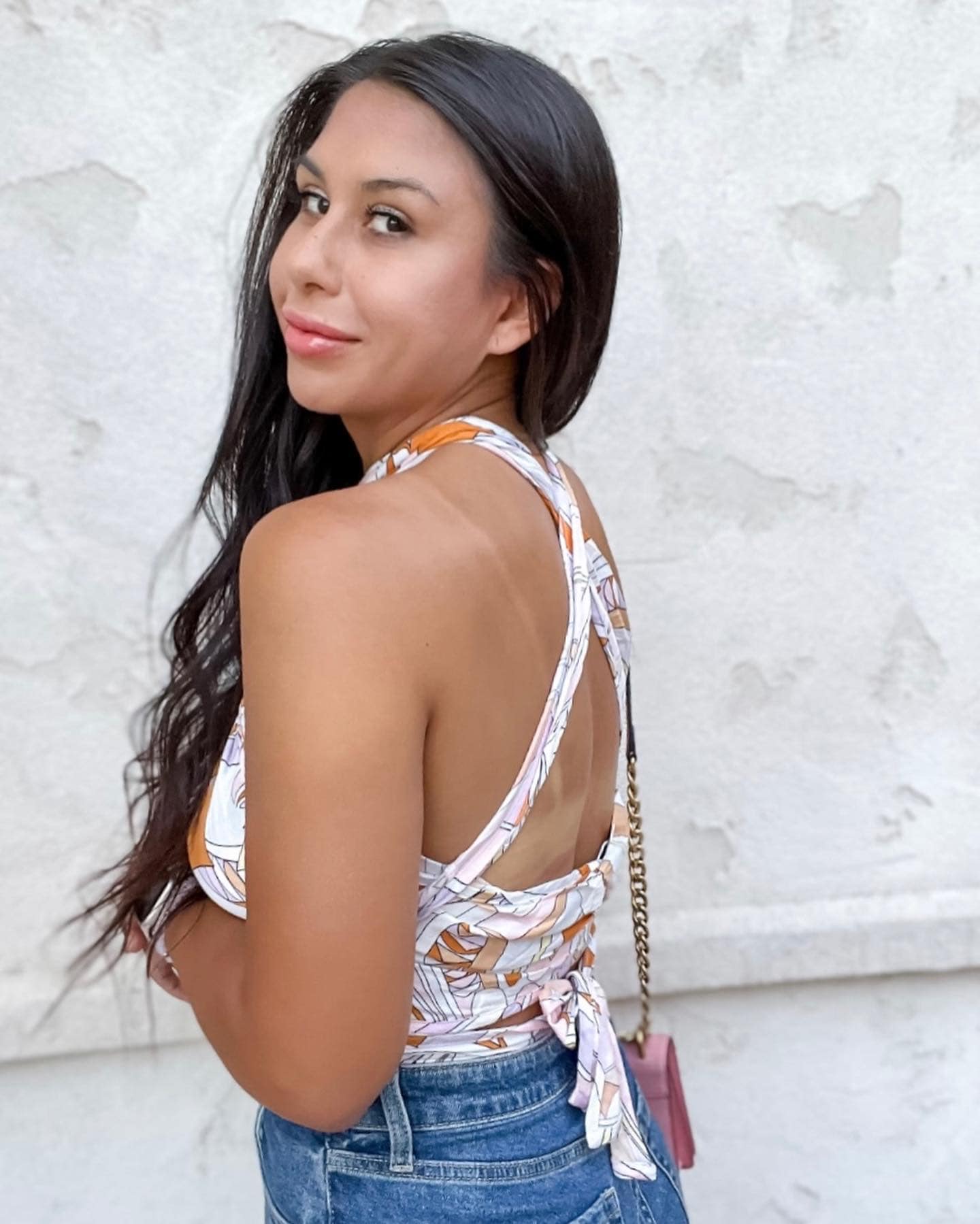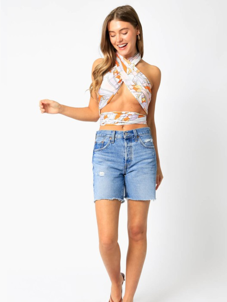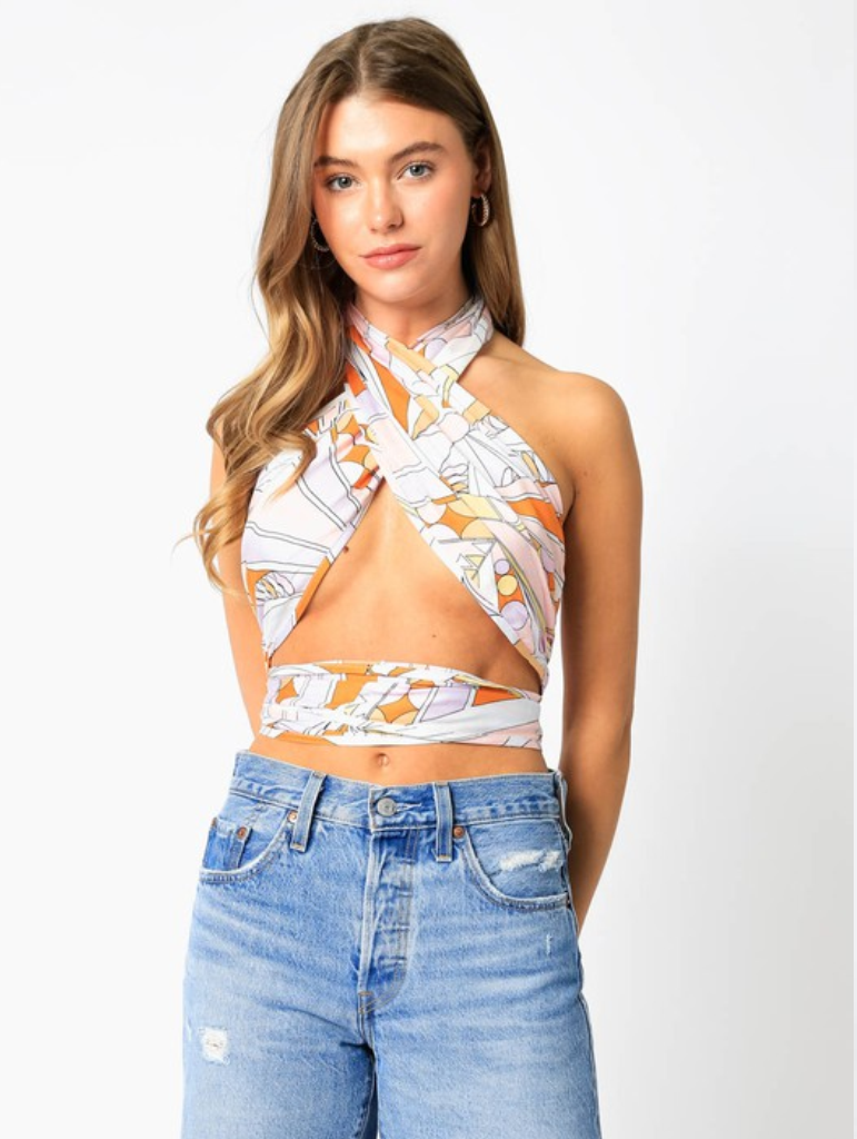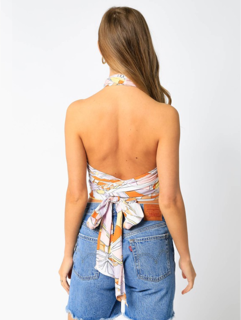 Our Ava Wrap Halter Top geatures a wrap styling with waist tie closure and a cut out design.