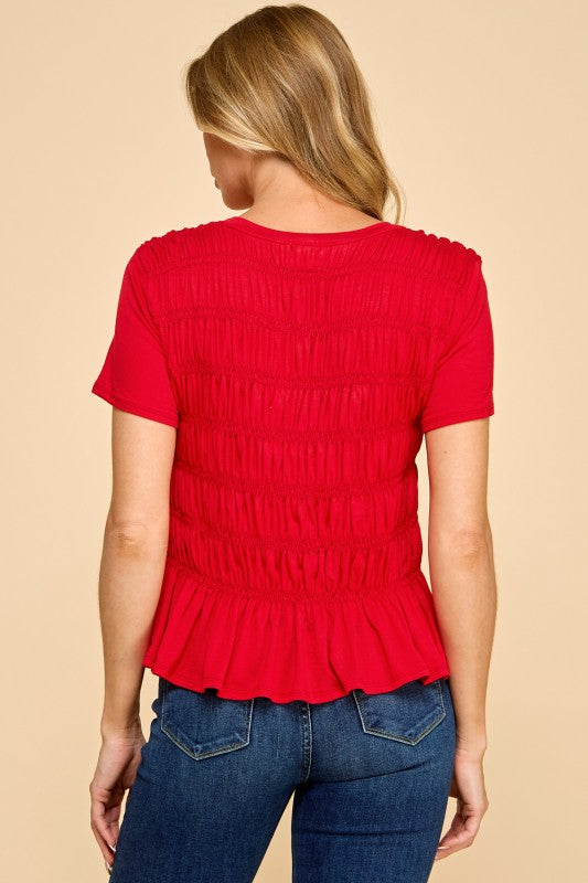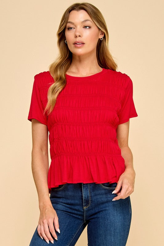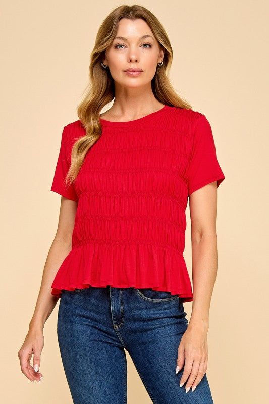 This solid top features elegant smocked detailing that adds texture and charm to a classic silhouette. Made from soft, breathable fabric, it offers both comfort and style. Perfect for casual outings or dressing up with accessories, this versatile piece pairs effortlessly with jeans, skirts, or trousers for a polished look.