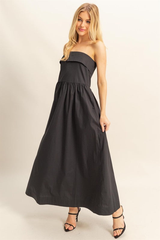 Introducing the Dreamy Gaze Dress, the perfect dress for warmer weather! Made with lightweight poplin, this dress features a strapless neckline with fold over detail and a snug bodice for a flattering fit. The attached skirt flares out beautifully into a midi hem. Embrace the dreamy and flattering look!z