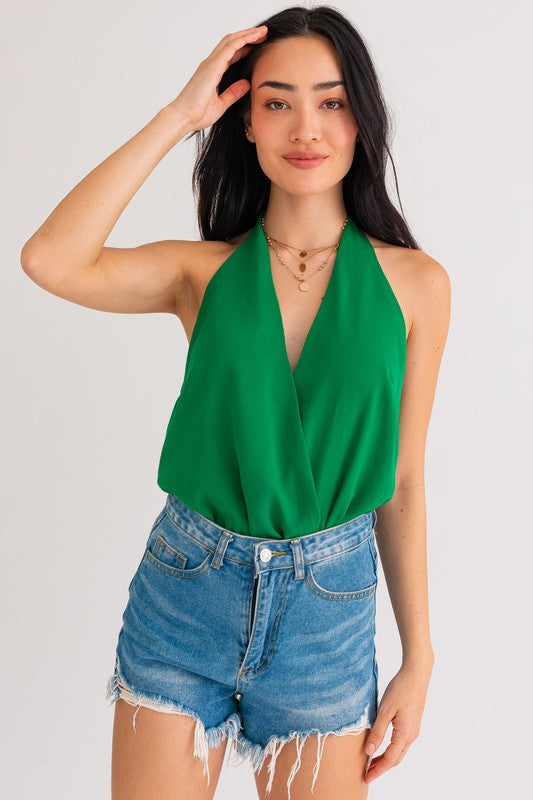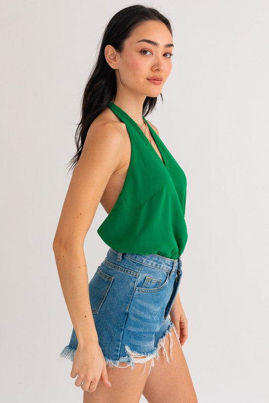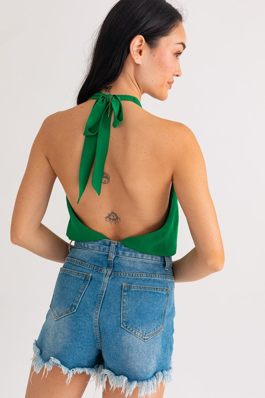 Make a bold statement in our Everlasting Bodysuit! It features a cool green hue, a tie neck, and a plunging v-neck - all with an open back for a dramatic look. Get ready to be the center of attention in any room you walk in!