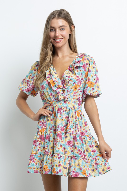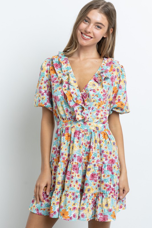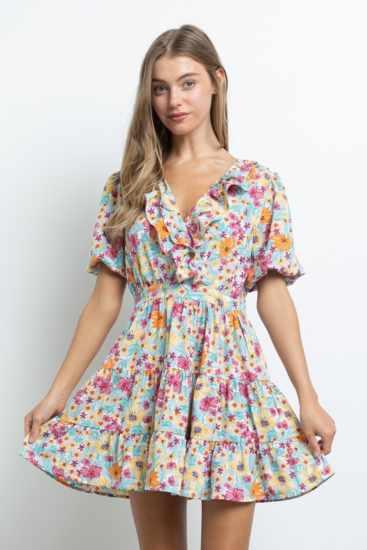 Short sleeve mini dress with ruffle detail at V-Neck line