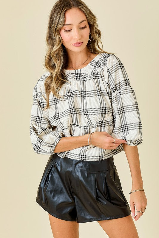 Get cozy and stylish with our Forever Yours Top! Made with soft corduroy, this top features a round neck and 3/4 sleeves. The quirky printed plaid adds a fun twist. You'll never want to take it off!