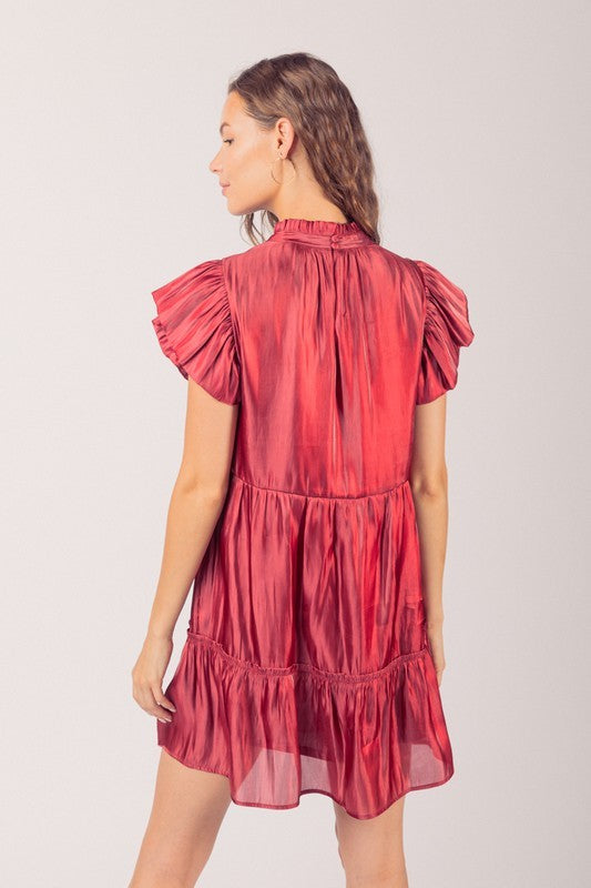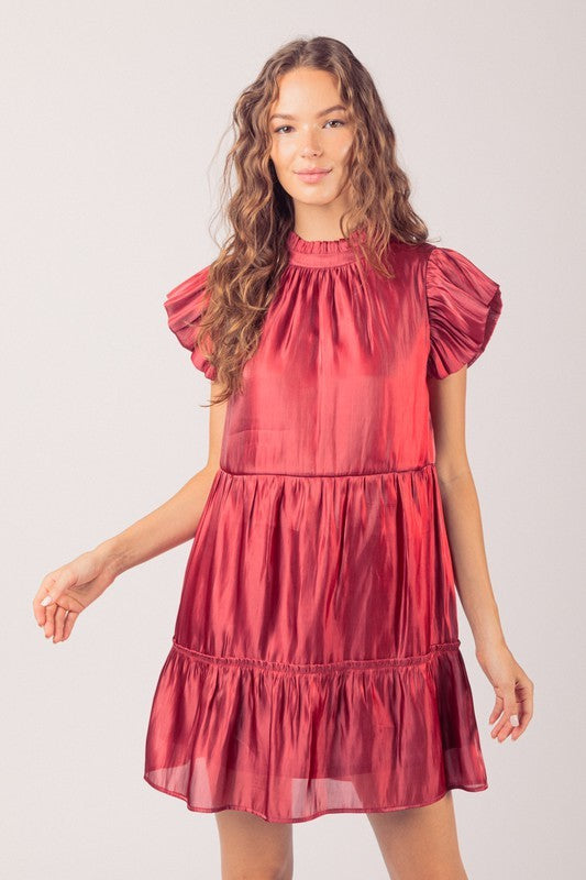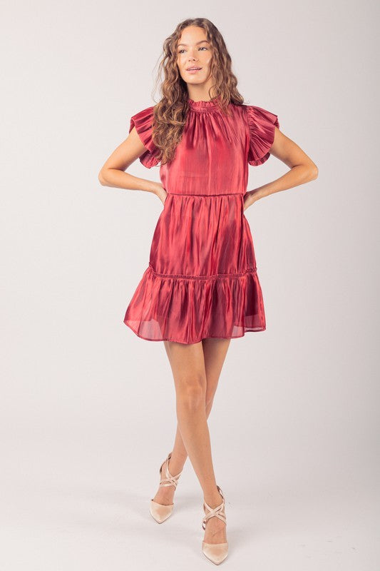 Make a dazzling entrance this holiday season with our Holiday Party Dress- a sophisticated and shimmering design with a high ruffle neck, short ruffle sleeves, a back keyhole, and tiered layers for added movement. Lined for a perfect fit, this mini masterpiece will ensure you sparkle in style.