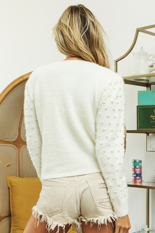 A beautiful statement piece to add to your wardrobe. Our Pearly White Sweater features pearl beads, a ribbon front, and a delicate eyelash knit. Be the life of the party and turn heads with this timeless look!